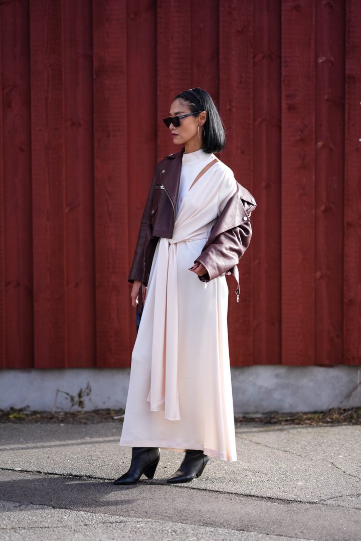 モードなジッパードレスにレザージャケットをレイヤード。エッジの効いた着こなしでもエレガントに決まっているのは、黒、ネイビー、ブラウンの絶妙なカラーパレットのおかげ。