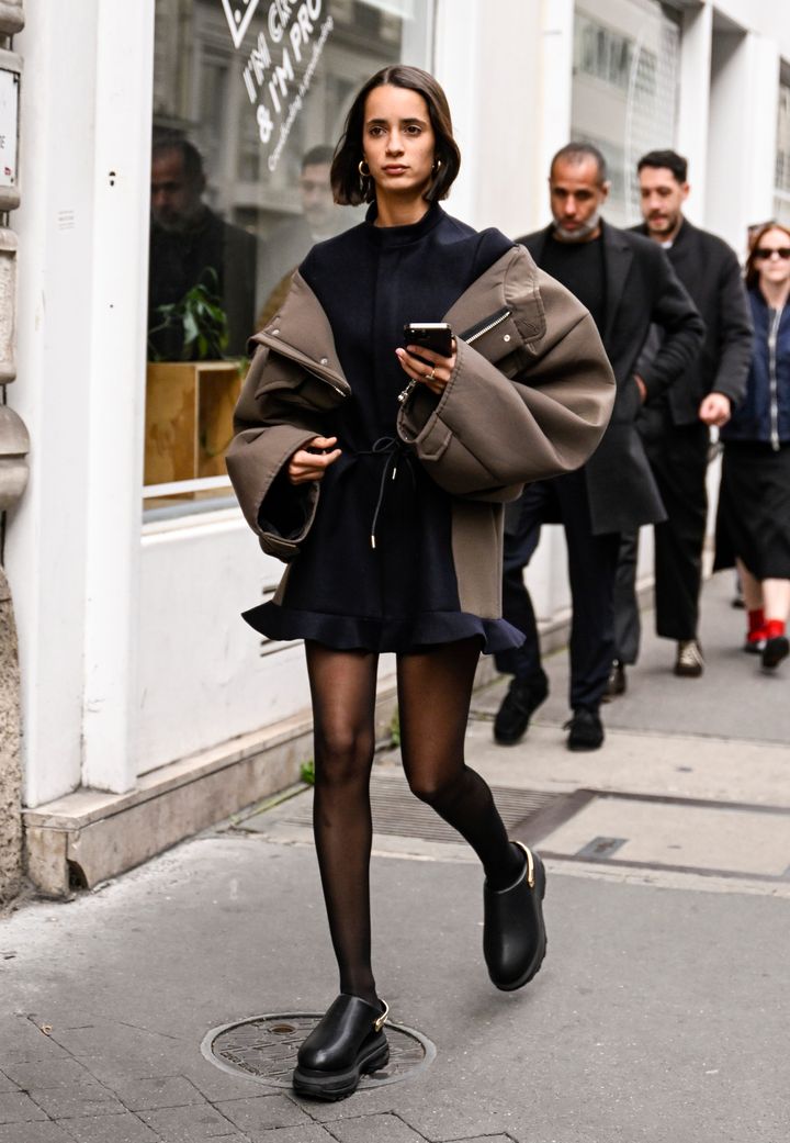 フレッシュな印象のミニドレスコーデだって、ブラウン×ネイビーでまとめれば大人ムード。アウターはビッグなシルエットを選ぶのが今のバランスです。
