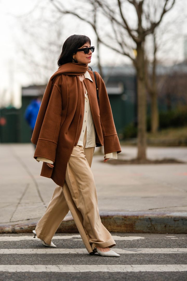 クリーム色のシャツとベージュのパンツ、ブラウンのコートと、少しずつニュアンスの違う茶色と、異なる質感を重ねてノンシャランなおしゃれが完成。ボリュームのあるマフラーを無造作に巻いて奥行きのある着こなしに。