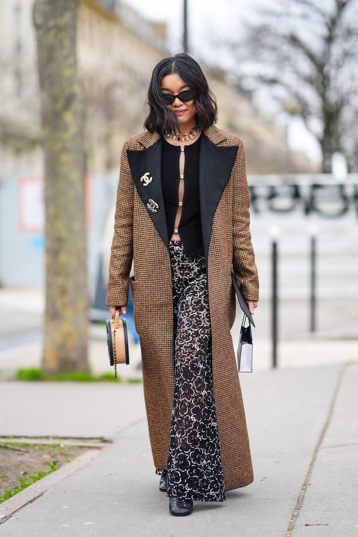 インパクト抜群のパンツに、同じくライトブラウン×ブラックのロングコートを合わせた、こなれた装い。ブラックで縦長のシルエットを強調してスタイリッシュに。ネックレスとブローチがリュクスなアクセント。