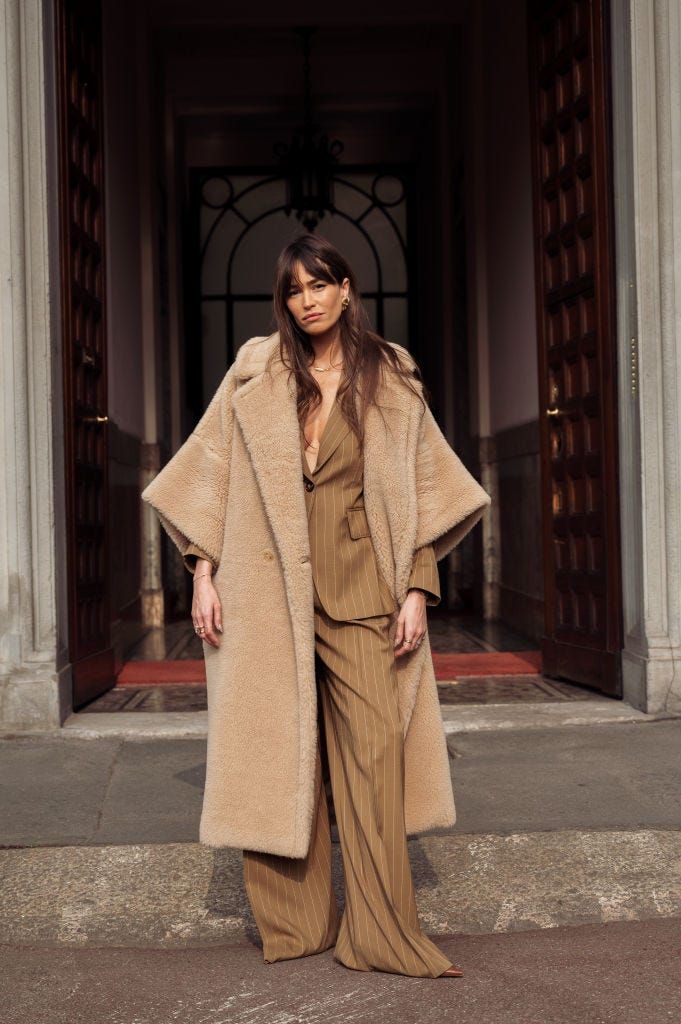 ベージュのピンストライプのマニッシュなジャケットスタイルに、ファーコートを合わせて、ぐっとドラマチックに。淡い色合いを重ねるからテクニックいらず! 秋冬ファッションが暗くなりがちなら、すぐにでも真似したいスタイリングです。