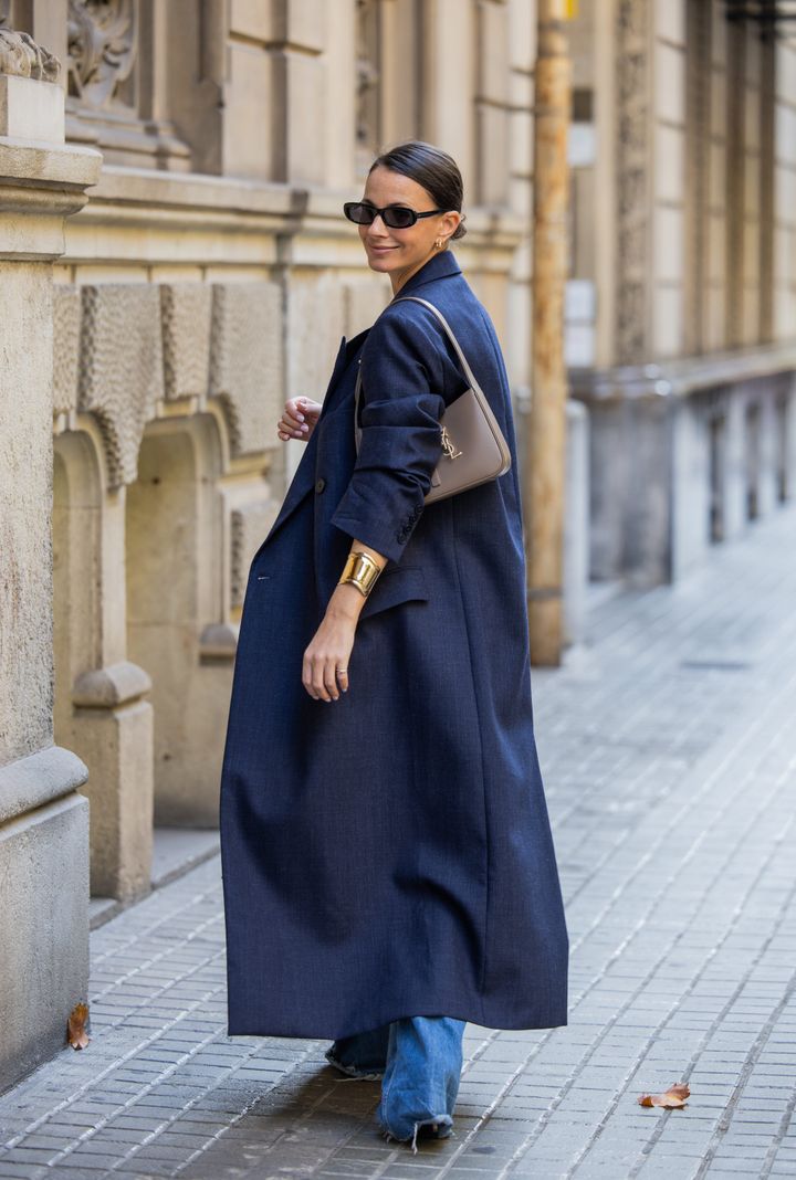 オン・オフ問わず万能なネイビーのスプリングコート。アクセントとなるブラウンのバッグは、淡い色合いがコーデに馴染んで、エレガントな印象をキープ。ゴールドバングルのスパイスもGOOD。