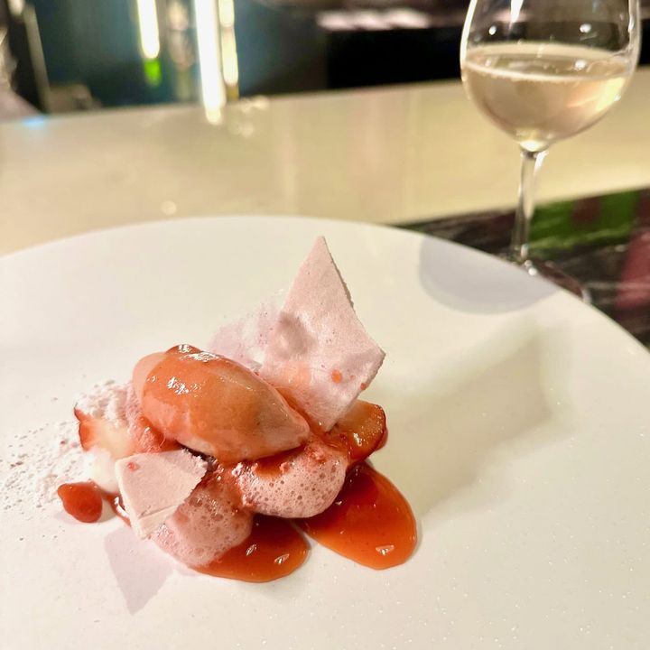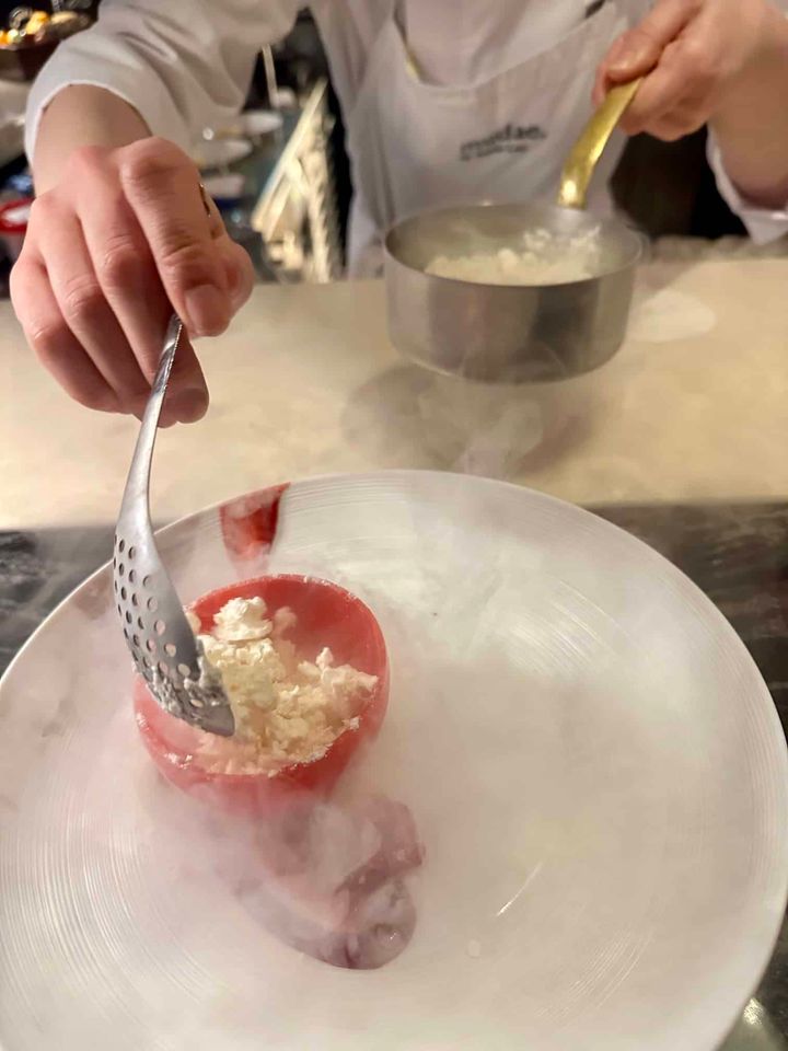 ストロベリーイチゴとバジルのソルベのトップに綿菓子をふんわりと飾り、ストロベリーのソースを注いで溶かして仕上げる一皿。綿菓子が溶ける様子を目の前で楽しめる演出に目を奪われます。