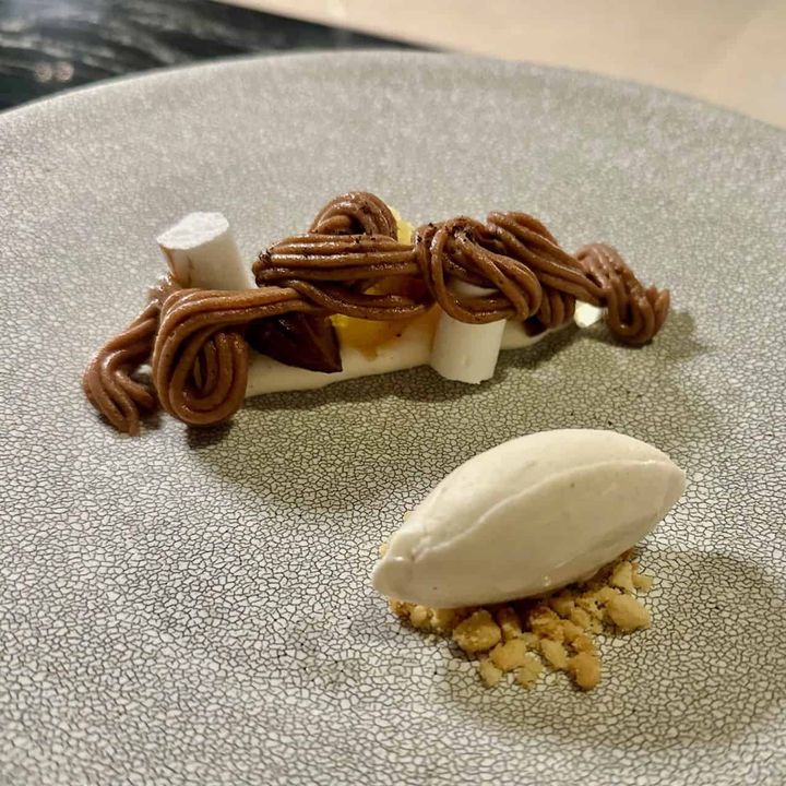 モンブランバニラのクリームと柚子のゼリーを忍ばせた上にモンブランクリームを絞り、バニラアイスを添えています。バニラはすべて、オーブンで鞘ごと焼いて粉砕しているため、香ばしい香りが特徴。