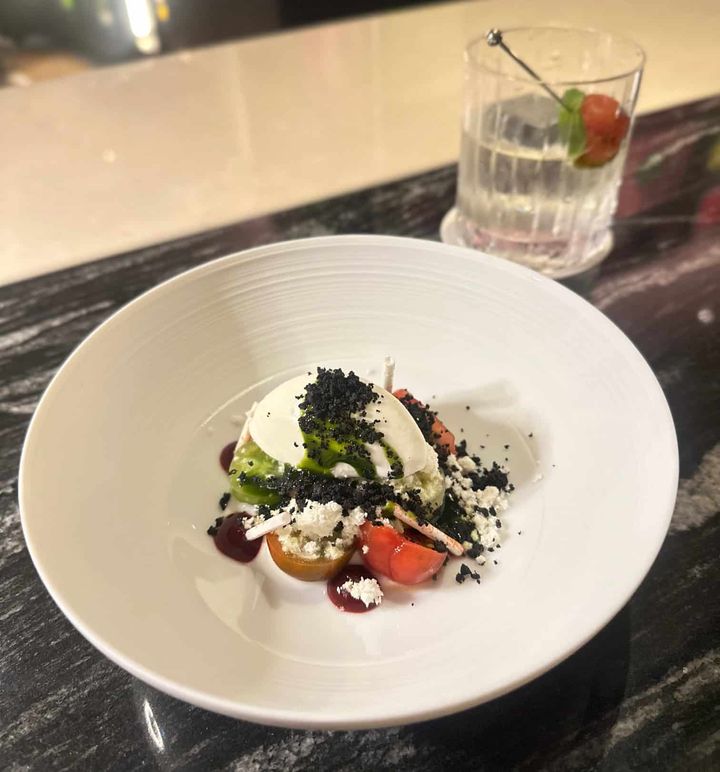 カプレーゼ(トマト、バジル、パルミジャーノ・チーズ、ブラックオリーブ)カプレーゼサラダから着想を得た、ジャスティン氏のシグネチャーディッシュ。マリネトマトの甘さ、メレンゲのサクサクとした食感とほんのりとした甘み、そしてさっぱりとしたヨーグルトが重なる一品です。