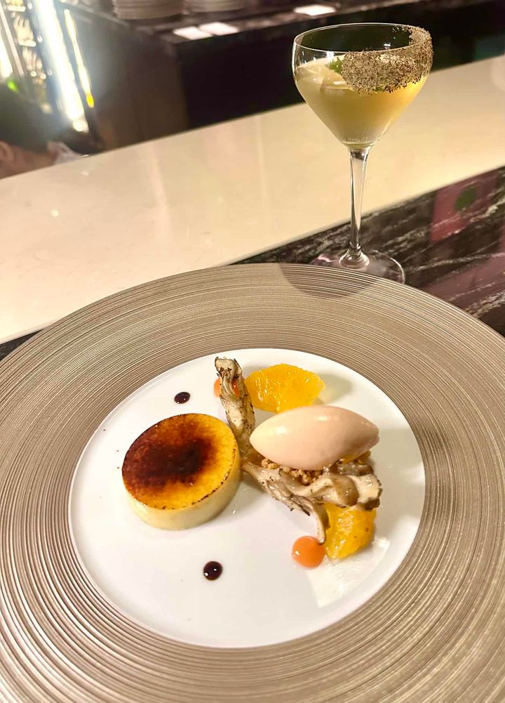 マイタケ(舞茸、マルサラワイン、オレンジ、バルサミコ)香ばしくソテーした舞茸と、瑞々しい旬のデコポンを主役に、マルサラワインのクレームブリュレと、ブラッドオレンジのソルベ、バルサミコソースを合わせた一品。ブリュレのキャラメリゼ、松の実のクランブル、舞茸の歯ごたえなど多彩な食感が魅力。