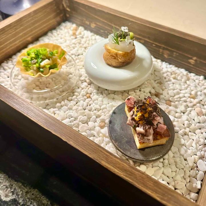 コースの締めくくりを飾る「クラナカン」では、目の前で液体窒素を使ったライブパフォーマンスも。冷気の中から現れる最新の技法と、伝統的な素材の融合——。 それはまさに、一皿ごとに幕が上がる舞台を特等席で眺めているような、贅沢な体験です。