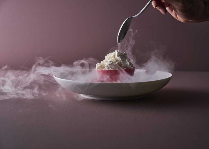 クラナカン(ラズベリークリーム、ハニー、オートミール、ウイスキー)ヴァローナ社の「デュルセ」チョコレートを使用した濃厚なクリームと、ハニーで香ばしくローストしたオートミール、そしてその上に鮮やかなラズベリーシャーベットのカップをスタンバイ。仕上げに、ゲストの目の前で液体窒素を用いて急速冷却するウイスキークリームを加え、味はもちろんのこと見た目も驚きに満ちたデザートへと変貌します。