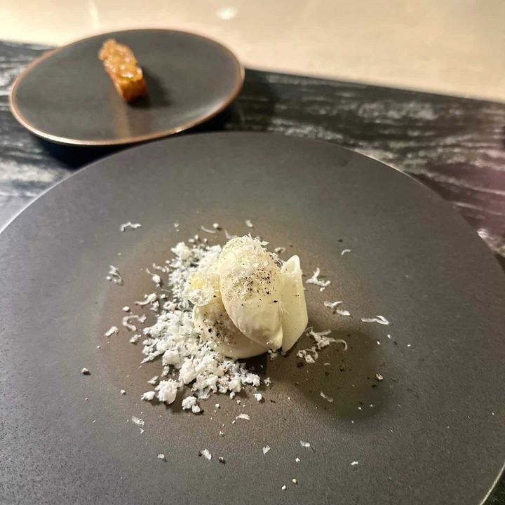 カルボナーラ(ベーコン、オニオン、ペコリーノ、カンポットペッパー)クリーミーなカルボナーラソースとジェラートの素材構成の類似性に着目した、遊び心溢れる一皿。ベーコン風味のアイスクリームに、カンポットペッパー(カンボジア産の香り高い黒胡椒)が香る濃厚なクリームを合わせ、ブリオッシュトーストとともに2時間じっくりと炒め上げたオニオンジャムを添えています。