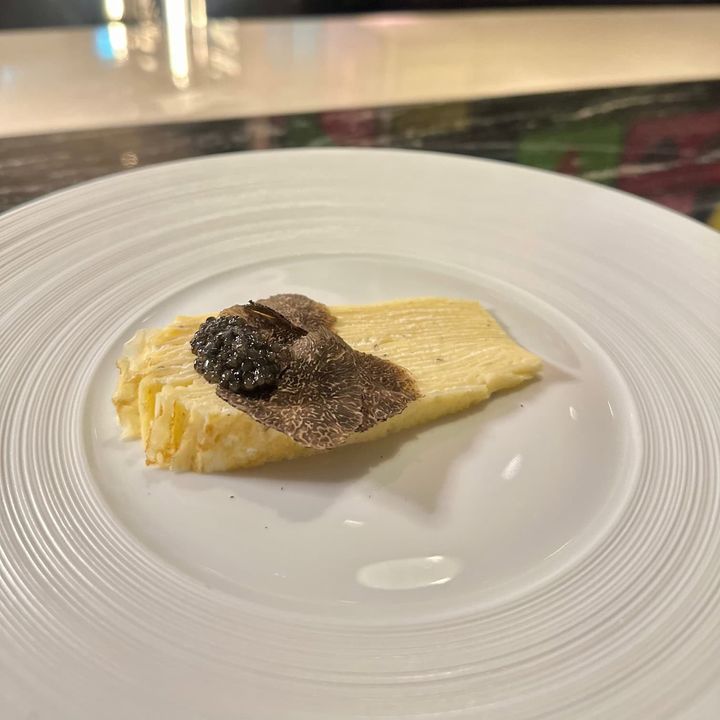 トリュフ&キャビアクレープ甘さ控えめのレアチーズケーキの上にキャビアやトリュフをたっぷりとのせた贅沢なデザート。塩味と甘味が口の中で交互にハーモニーを奏でます。