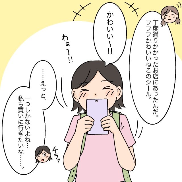 由依さんが「丁度通りかかったお店にあったんだ。フフフ。かわいいね、このシール」と言うと、「かわいい~!!わぁ~!!」と大興奮のあいちゃんは、少し落ち着いてから「・・えっと、一つしかないよね・・私も買いに行きたいな・・」とチラッと結衣さんを見ました。