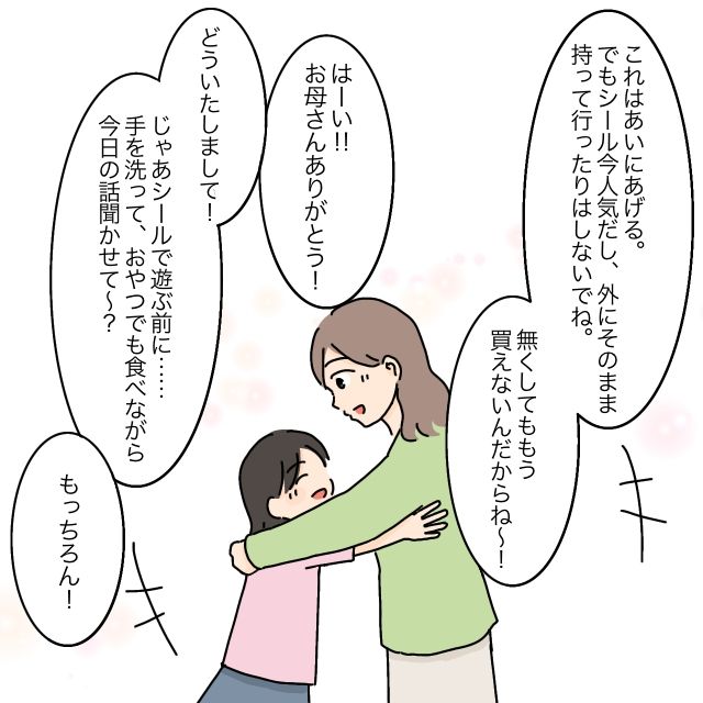 由依さんは「これはあいにあげる。でもシール今人気だし、外にそのまま持って行ったりはしないでね。無くしてももう買えないんだからね~!」と約束事を伝えてあいちゃんにシールを渡すと、あいちゃんは「はーい!!お母さんありがとう!」と満面の笑みで言いました。「どういたしまして!じゃあシールで遊ぶ前に・・手を洗って、おやつでも食べながら今日の話し聞かせて~?」「もっちろん!」と2人はおやつを食べながら楽しい時間を過ごしました。