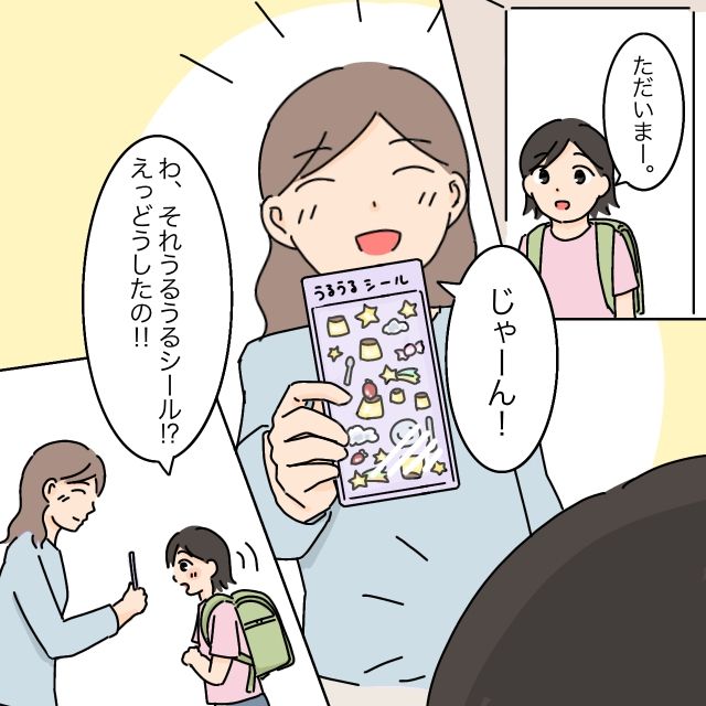 数時間後、「ただいまー」と学校から帰って来たあいちゃんに「じゃーん!」とうるうるシールを差し出すと、「わ、それうるうるシール!?えっ!どうしたの!!」と目を輝かせるあいちゃん。思った通りの反応に結衣さんは嬉しくなります。