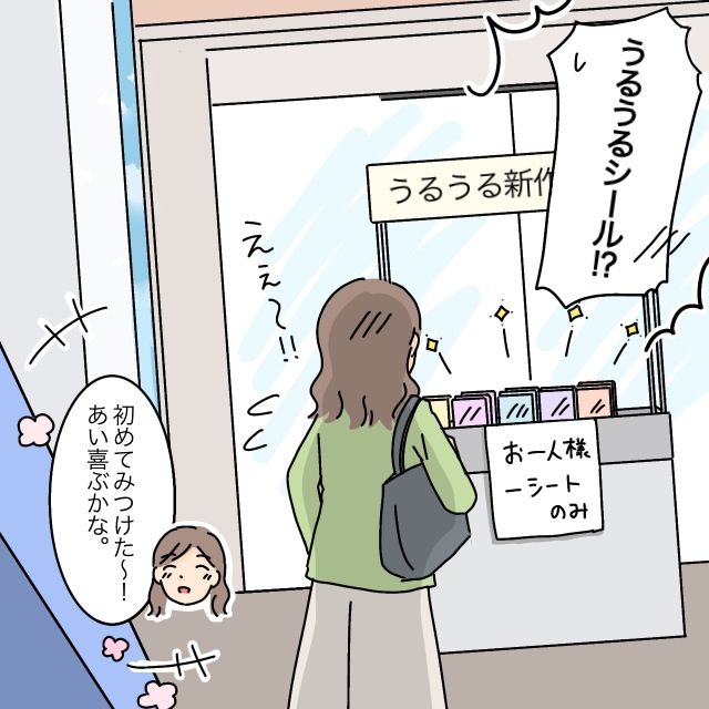 なんと、そこには入手困難なうるうるシールの新作が並んでいたのです。もちろん「お一人様1シートのみ」と制限はありますが、まだみんな気づいていないようで人だかりもできていません。「うるうるシール!?えぇ~!!」と思わず驚きの声をあげつつ、由依さんは新作のうるうるシールを1枚手に取りレジに向かいました。初めてうるうるシールを購入できた結衣さんは「初めて見つけた~!あい、喜ぶかな」とご機嫌で帰宅しました。