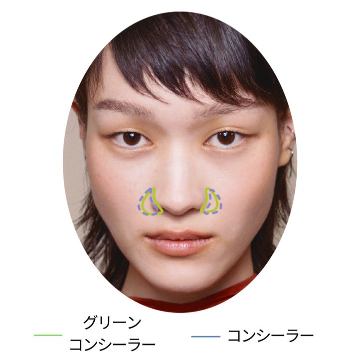 「透明感を高めるには、小鼻の赤みカバーが必須。赤みを消すグリーンのコンシーラーを、毛足が長めのブラシでトントンと薄く重ねて。上からベージュのコンシーラーを同じように薄く重ね、最後に明るめカラーのセッティングパウダーを小鼻に沿うようにブラシでのせると厚塗り感なく仕上がります」
