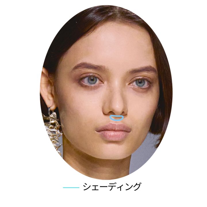「年齢を重ねると人中が伸びてきますが、鼻のすぐ下の部分に陰影をつけるだけで、人中が短縮して見え、若々しい印象に。やり方は簡単。シェーディングペンシルを人中の一番上部分にささっと引いて、指でぽんぽんとぼかしてなじませるだけ。自然なのに効果的なテクニックです」