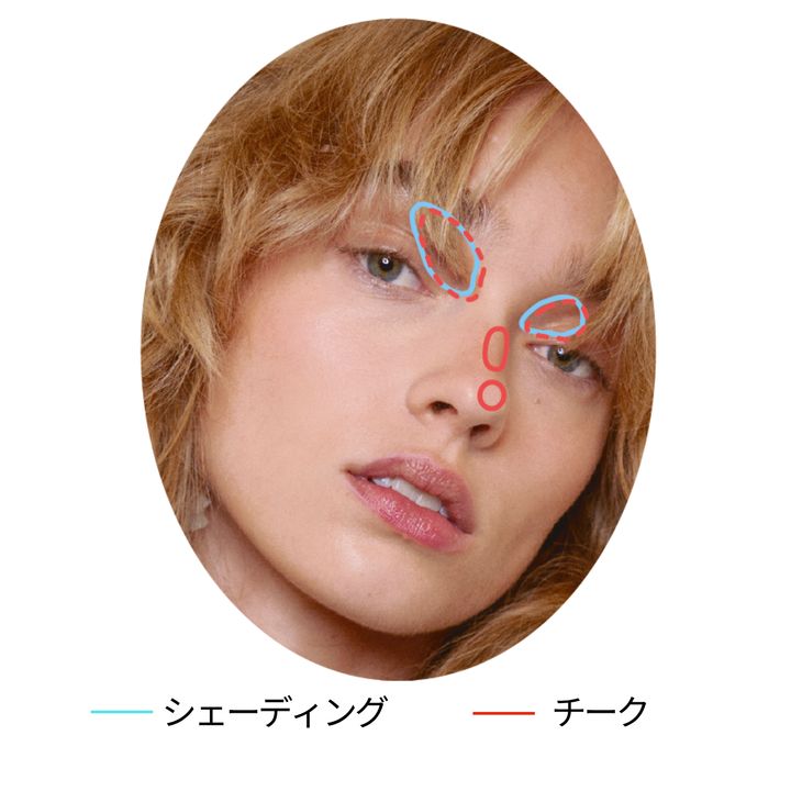 「シェーディングを入れすぎると怖く見えたり老けて見えがちですが、上からチークやハイライトを重ねることで一気にフレッシュでかわいい印象になります。目頭の上部分に1で陰影を入れ、上から2 のチークとハイライトを混ぜてオン。鼻先や鼻の真ん中にも2でツヤと血色を足して」