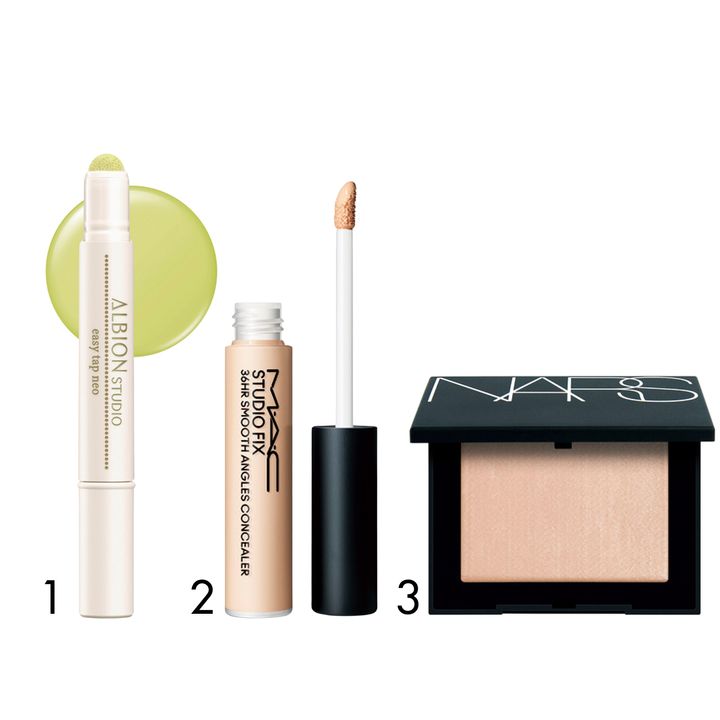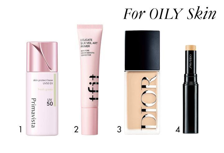 「オイリー肌でメイクが崩れやすい人は、油分の多いアイテムを使うとよれやすいので、マットな質感のファンデーションがおすすめ。コンシーラーもスティックなど硬めのものを選んで。下地は皮脂崩れ防止効果のあるものを。毛穴の開きが気になる人は、毛穴を埋めてくれるパテ系の下地を追加してもいいです」