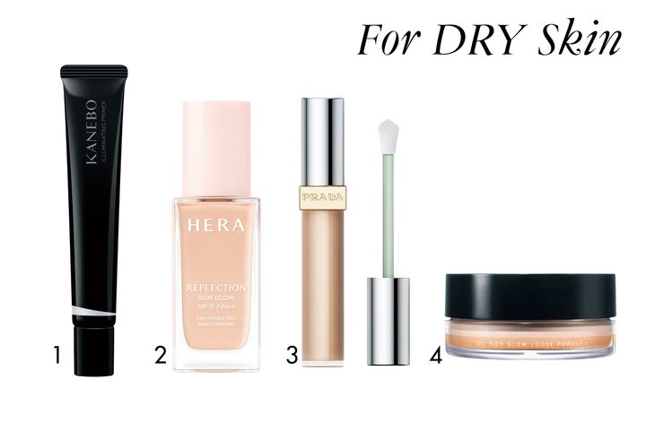「乾燥肌の人はまずスキンケアで水分・油分を与え、しっかりと潤いを補給しておくこと。そのうえで、保湿感のある下地、ファンデを選びましょう。今季はとくに素肌のように軽やかな肌がトレンド。ツヤ感と保湿感をかなえるリキッドファンデ、リキッドコンシーラーで肌を整え、しっとりとオイルリッチなお粉で仕上げて」