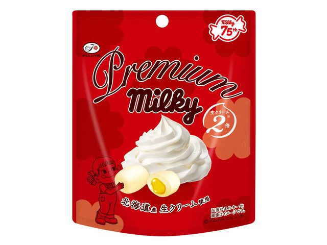 ・ミルキー75周年を記念した特別な新商品 ・北海道産生クリームを、通常の「ミルキー」の2倍配合した、リッチでコク深い味わい ・とろ~りとろける練乳ソースが入ったやわらか食感のプレミアムな品質 ・ミルキーを象徴する赤いパッケージが目を引く、ジッパー付きパウチパック