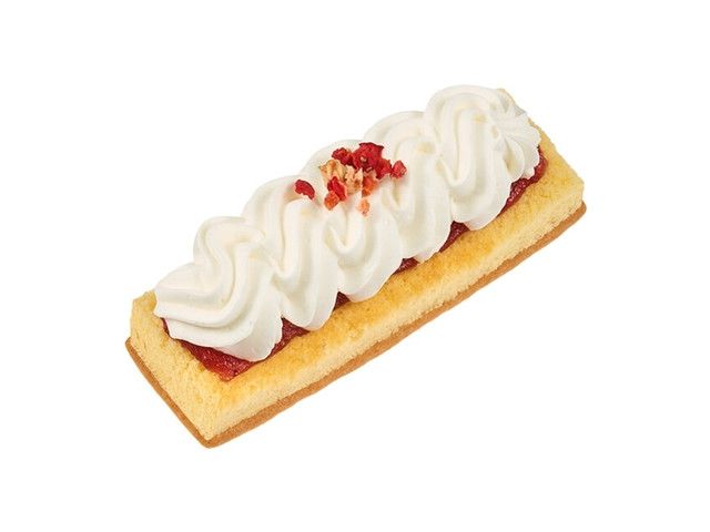 クッキーの上にスポンジを乗せ、イチゴソースを絞り、ホイップクリームで仕上げ、フリースドライのイチゴをトッピングしました。 取り扱い店舗 全エリア