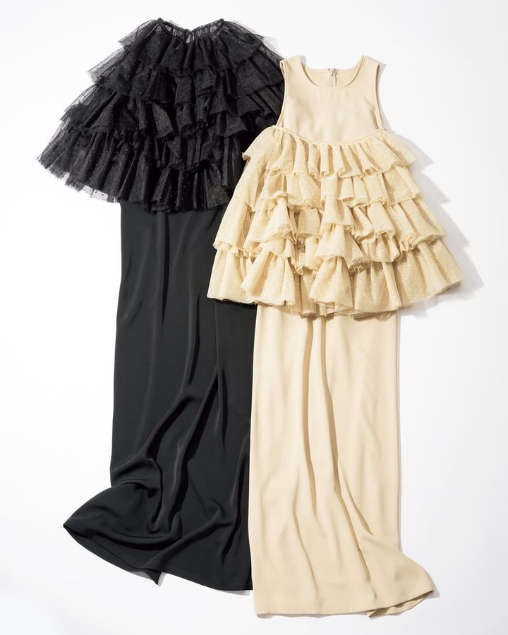 ドットチュールを重ねたケープがアクセント。肩にかけて華やかに、ビスチェのように巻けばデイリーに着られるドレスは落ち感のある生地を使用し、シワになりにくい。