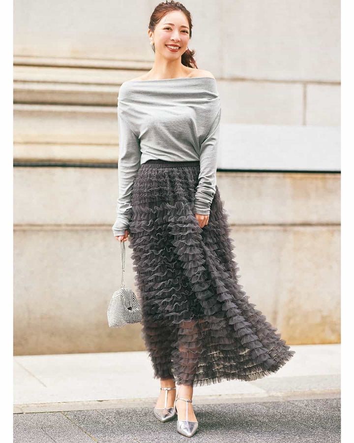 細かいチュールのフリルはほんのり透けを楽しめます。膝のあたりまで裏地がついているので、臆せずトライでき、ウエストはフルゴムなので、ストレスフリーの穿き心地。