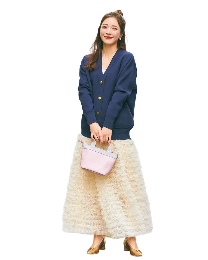 バッグ¥9,900(ウイトート コウベ)カーディガン¥17,600(カデュネ/カデュネ プレスルーム)スカート¥12,100(ブラン)パンプス¥17,600(ダイアナ/ダイアナ 銀座本店)ピアス¥26,400(LiiiN /ロードス)