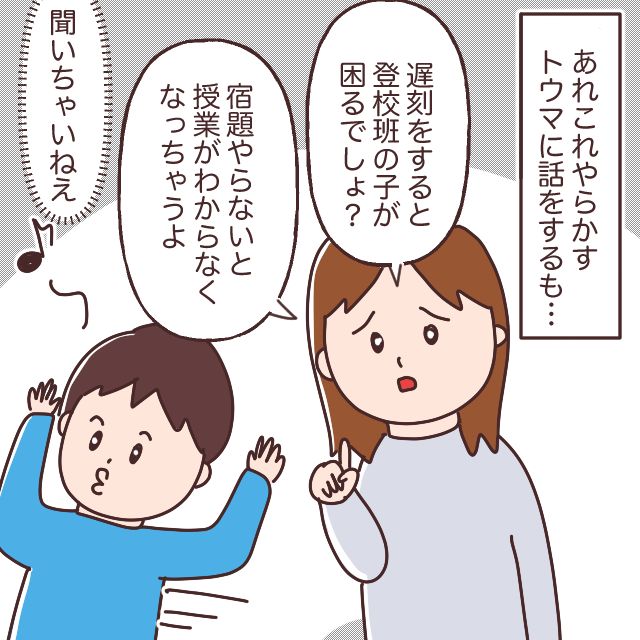あれこれやらかすトウマに呆れつつ話をすることにした私は、「遅刻をすると登校班の子が困るでしょ?」とか「宿題やらないと授業がわからなくなっちゃうよ?」とか言ってはみたのですが・・全く聞いちゃいません。
