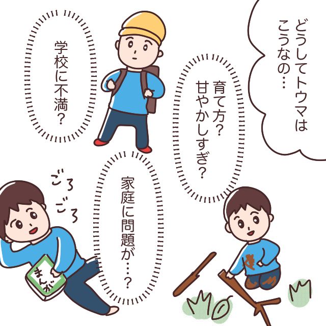 「どうしてトウマはこうなの・・?」と思った私は、「育て方が悪い?甘やかしすぎ?学校に不満があるの?もしかして家庭に問題があるのかも・・」と考え込んでしまいました。