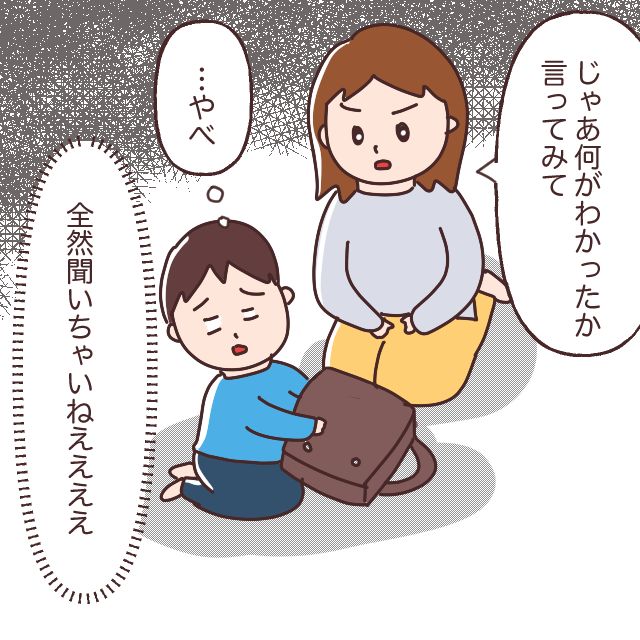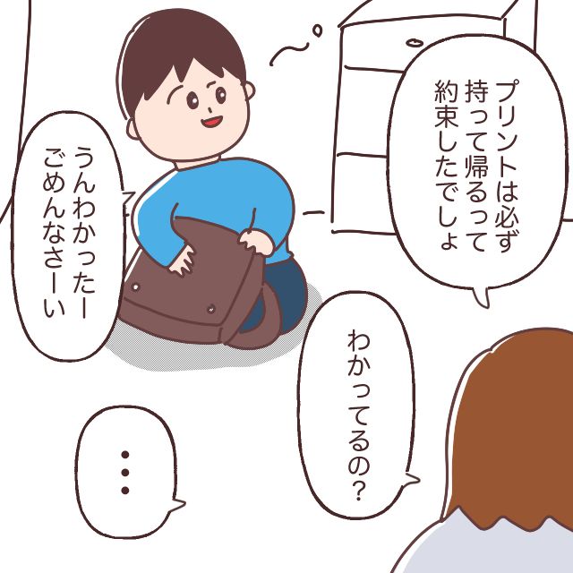 学校から帰ってきたトウマがプリントを忘れた日には、「プリントは必ず持って帰るって約束したでしょ。わかってるの?」と注意するも、「うんわかったーごめんなさーい」と完全にわかっちゃいないトウマの様子を見て言葉を失った私が、