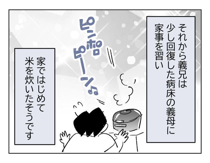 マキコさんのお義兄さん・ノリオさんは独身実家暮らし。お義母さんに家事をすべてお任せしていたのですが、この度、そのお義母さんが入院。追い詰められたお義兄さんは、17歳の姪ミクさんに家事をやってもらおうと、マキコさんの自宅前で待ち伏せします。しかし、それを偶然目撃した近所のおばさん・サトウさんがあいだに入り、無事解決しました。そしてその後……。