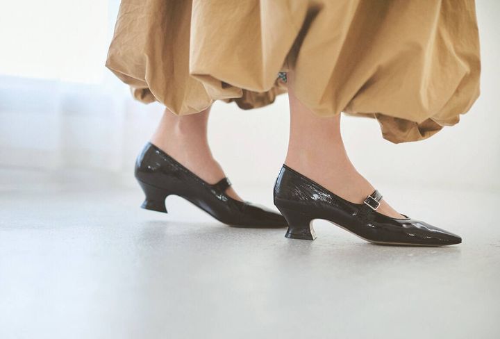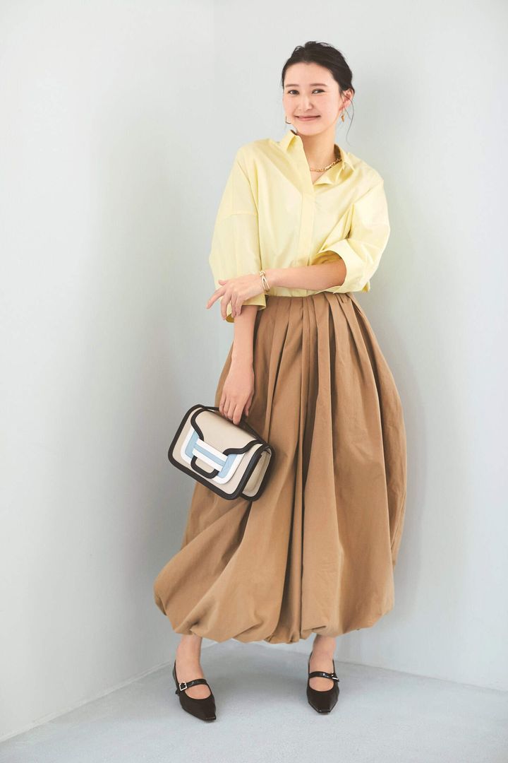 ボリュームあるバルーンスカートはシャツをインしてウエスト位置を強調。上半身をすっきり見せることでバランスよく着こなせます。足元は抜け感のあるヒールで、脚長効果をさらに後押し。