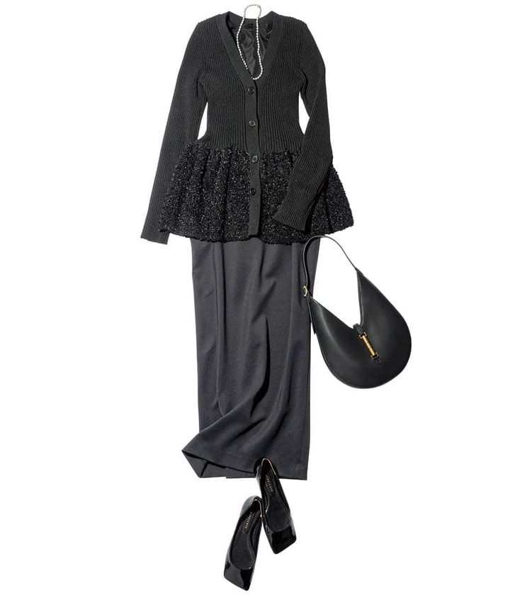 ペプラムシルエットのトップスでメリハリを構築したら、広がった裾との差を出すIラインスカートを仕込んで。もはや自動的に“キレイな体型”になれてしまう、最強の組み合わせです。