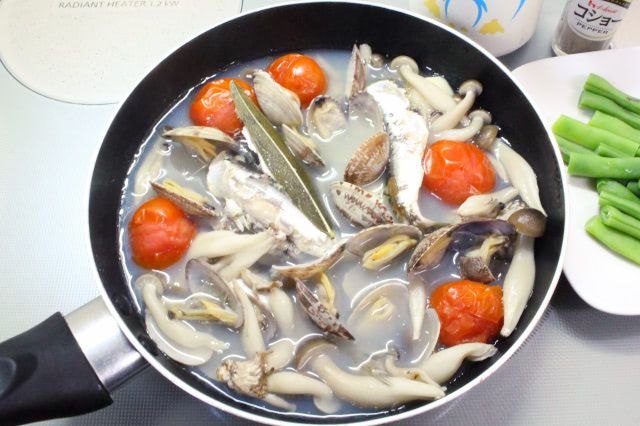 オリーブオイルでにんにくを1分ほど炒めると香りが立ったので、アサリ、イワシ、しめじ、トマトをまんべんなく入れ、水と白ワインを注いでローリエをのせました。