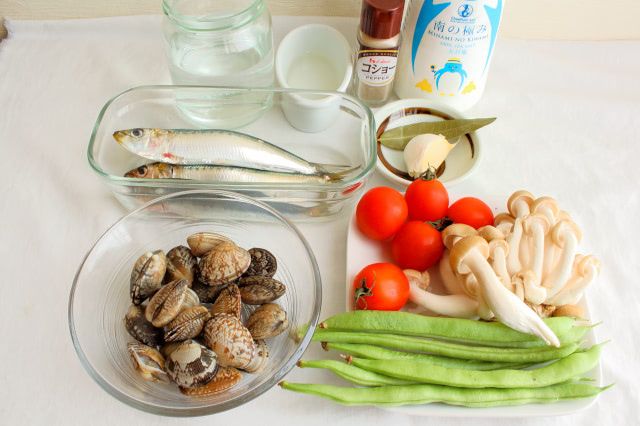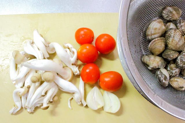 具はイワシの他にアサリ、しめじ、トマト、にんにくとシンプル。にんにくを切るだけなので、野菜の下ごしらえはあっという間です♪