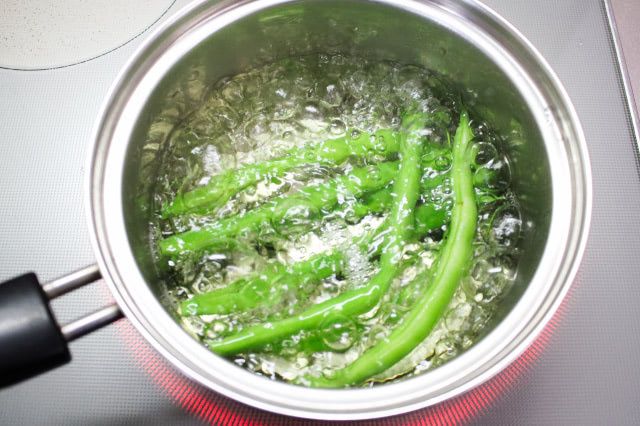 今回はさやいんげんで代用したので、お湯で2分ほど茹でて長さを3等分に切りました。