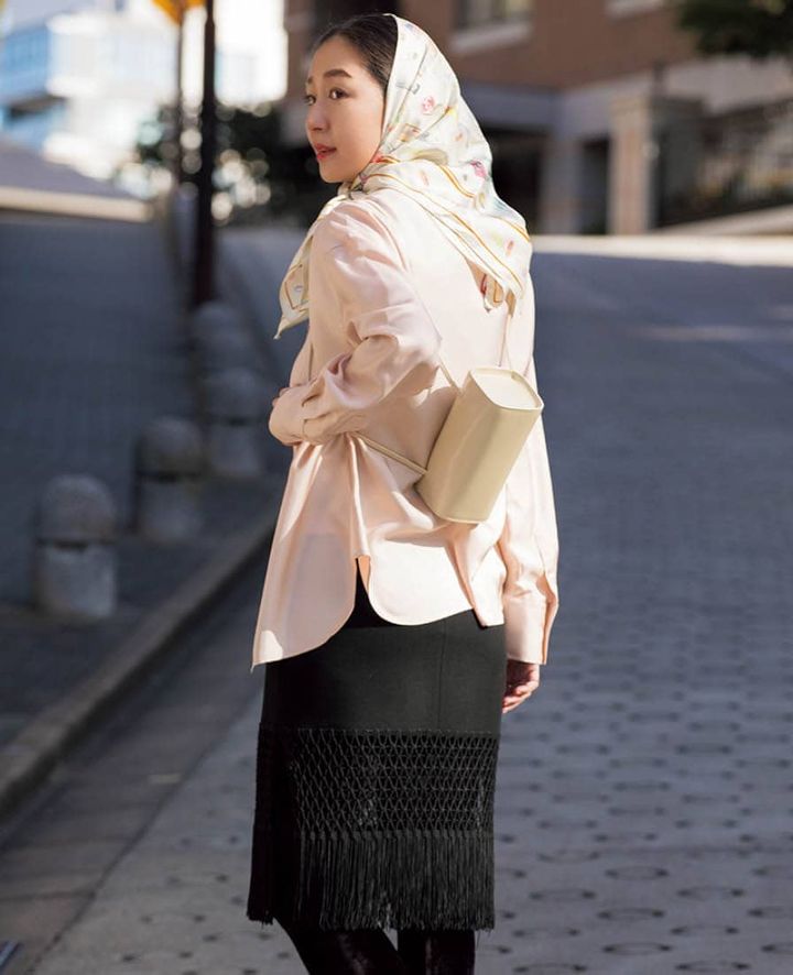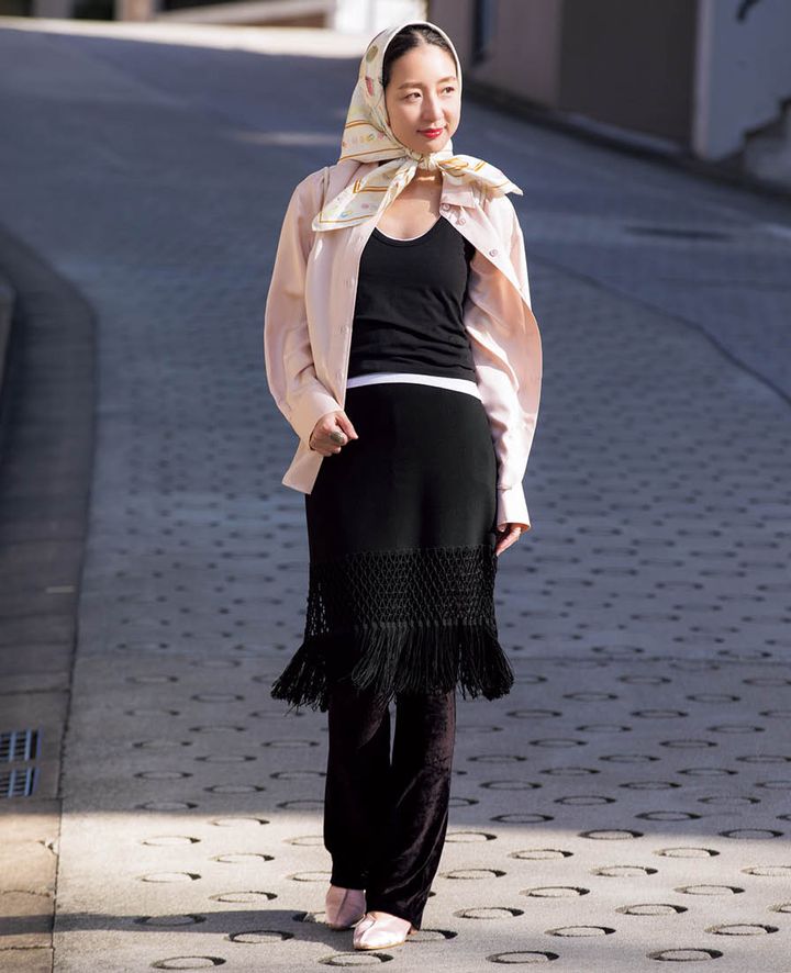 シャツ¥99,000(ローエ)、タンクトップ¥5,940※2枚セット(ヘインズ フォー ビオトープ)、バッグ¥126,500(フェイン)、リング¥47,300(※ヴィンテージ/全てビオトープ)、ヨー ビオトープのパンツ、エンポリオ アルマーニのヴィンテージスカート、シュプリーム×オーレルシュミットのスカーフ、アバウト アリアンヌのシューズは全て本人私物