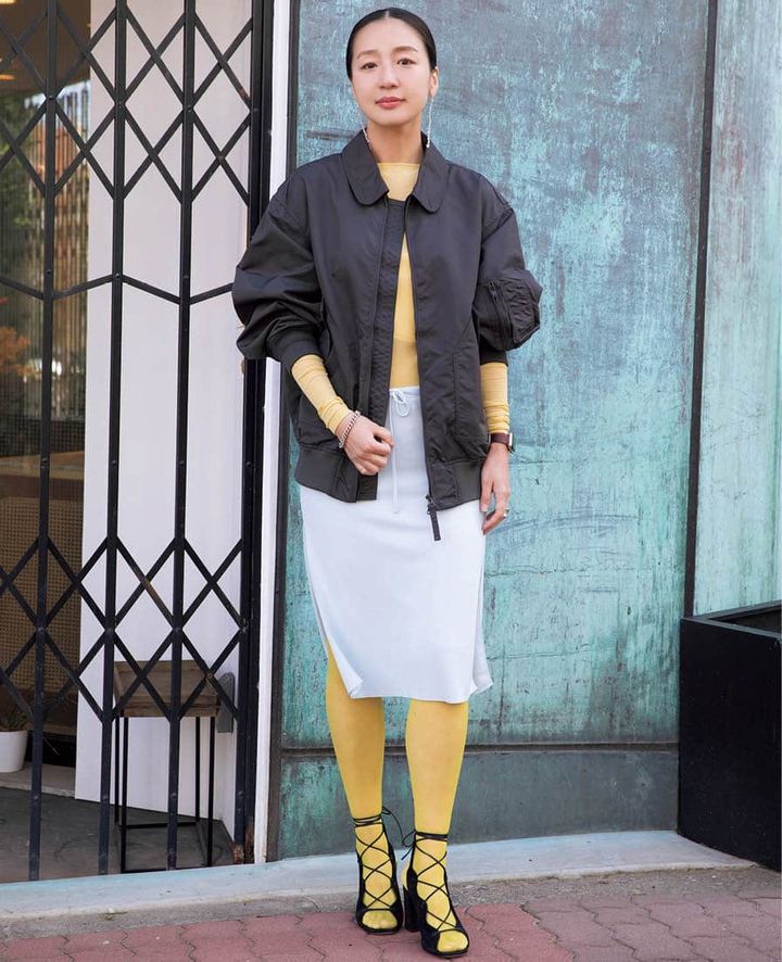 「冬に大人気だったハイクのフライトジャケットは中綿を抜いて春秋着やすくライトに別注。ボリュームシルエットが着たくて、あえて大きめをセレクト。女性らしいタイトスカートとカラータイツは、春色のカラーブロックで楽しみたい」