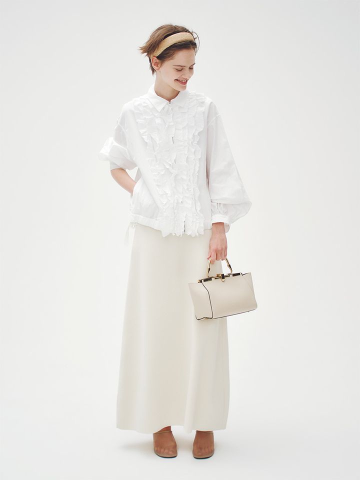 色もアイテム自体も甘さがある白スカートは、「広がりすぎない」形で糖度ひかえめに。軽さのある色だから、素材感にほどよい「重み」を加えることで、これからの軽装にもマッチしていくはず。