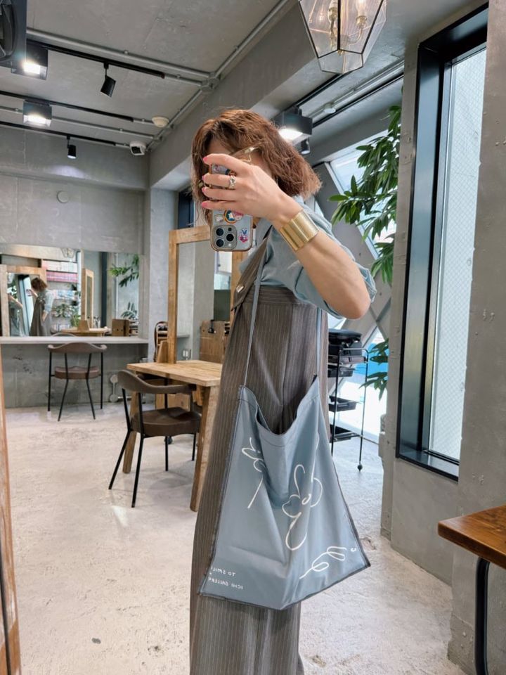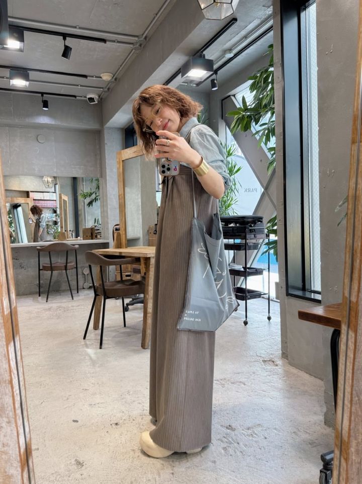 「すとんとしたシルエットがキレイな、room153のオールインワンが主役。グレージュカラーにストライプ柄入りで、すっきり見せてくれます。シャツやバッグを、同系色のアイスブルーをチョイスしたのもポイント。ボリューミーなバングルやシューズで全身のバランスを整えました!」(ヘアサロンPARKオーナー・水戸怜子さん)