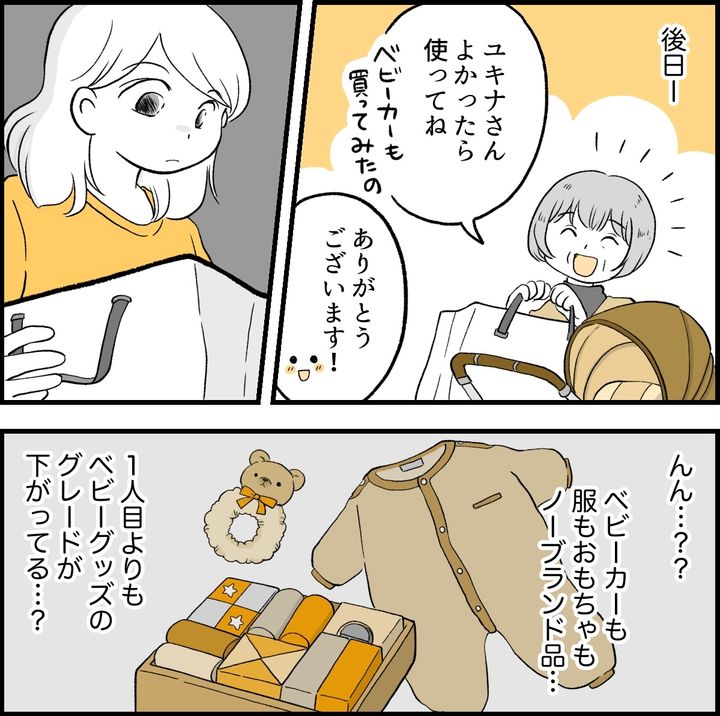 後日、義母が持ってきてくれたベビー用品は、上の子の時よりも明らかにグレードが下がっていました。私の不満そうな表情に気付いたのでしょう。義母は「どうせ1度きりで捨てちゃうでしょ?」と言ってきたのです。2番目だからと差別をした義母には、ガッカリしました。
