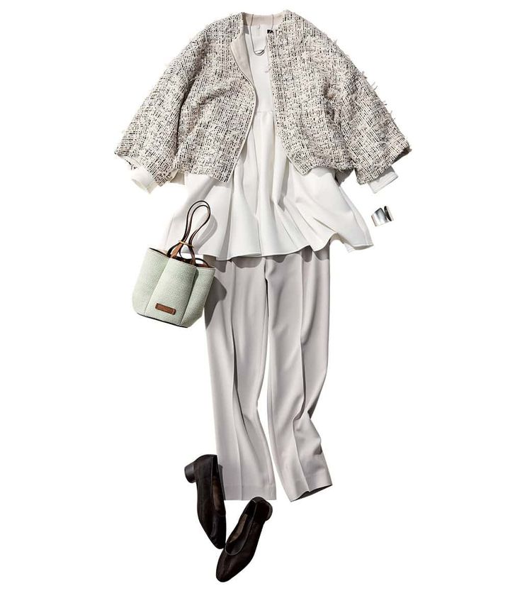 ツイードジャケット¥82,500(デパリエ/デパリエ 伊勢丹新宿店)ペプラムトップス¥23,100(ツル バイ マリコ オイカワ)パンツ¥12,000(PLST)バッグ¥42,900(ジャンニ キアリーニ/ジャンニ キアリーニ銀座店)メッシュパンプス¥13,200(ル タロン/ル タロン 有楽町マルイ店)ネックレス¥63,800(カミーユスロ/オブリオ)バングル¥7,830(アビステ)