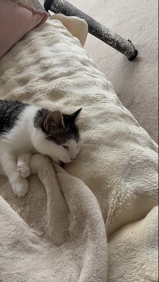 毛づくろいに夢中になっていたネコ。 しかし、ペロペロしているのは、自分のおててでも体でもなかったのです!!