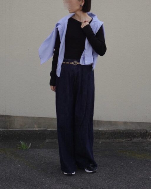 同系色のブルー(青)はネイビーのクリーンな印象を引き立てて、スタイリングをすっきりと上品に見せる色。特にネイビーのワイドパンツとブルーシャツの着合わせは、洗練見えする鉄板のコンビです。
