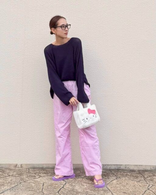 意外にもネイビーと相性がいいのが、パープル(紫)やピンク系の色。というのもネイビーにはパープル(紫)のニュアンスが含まれているため、自然と馴染み、差し色としても映えるんです。ピンクに合わせれば甘くなりすぎず、すっきりとした印象に仕上がるのも魅力。