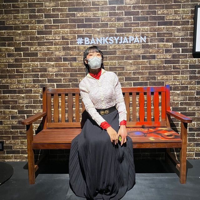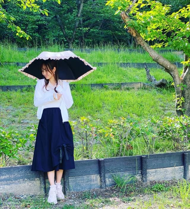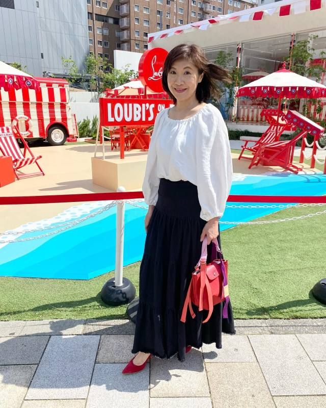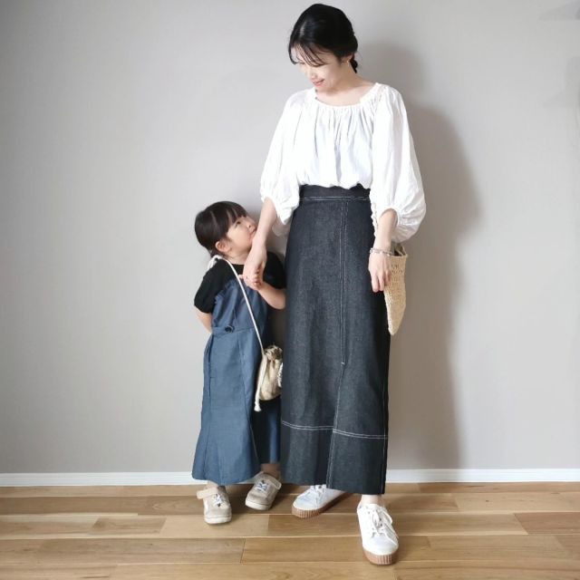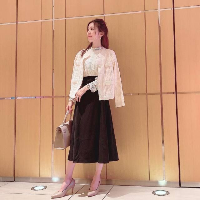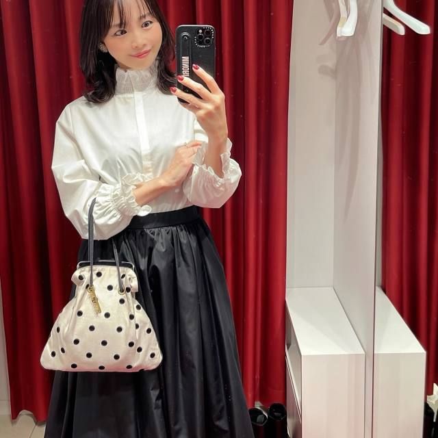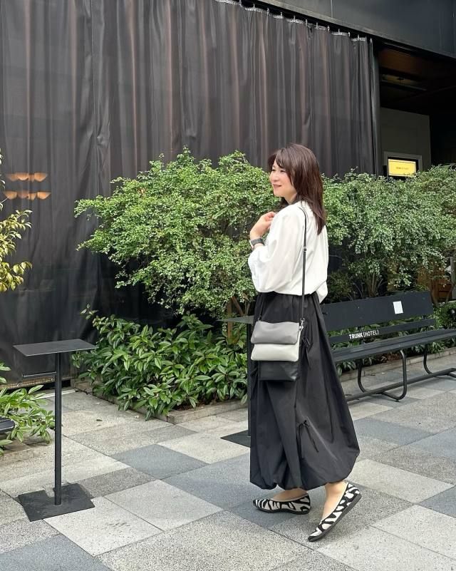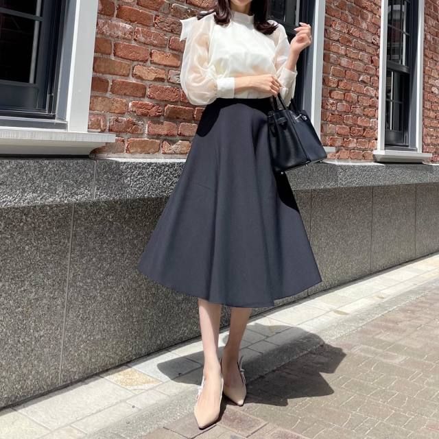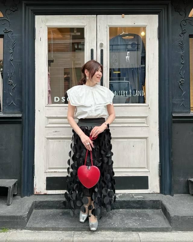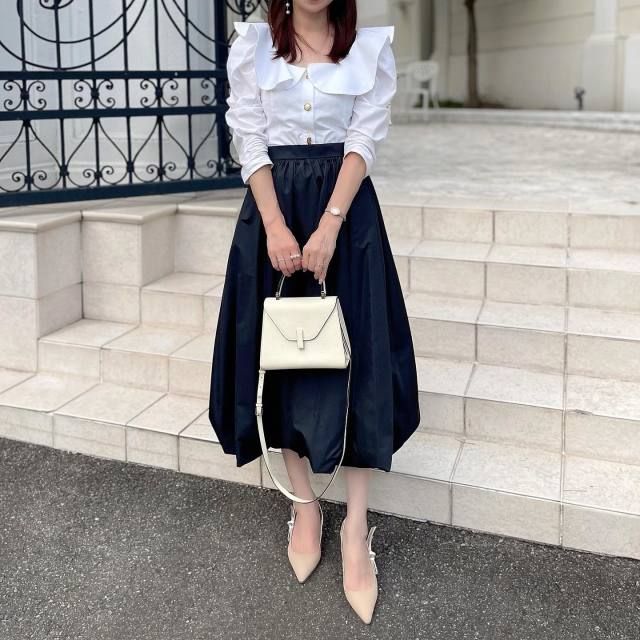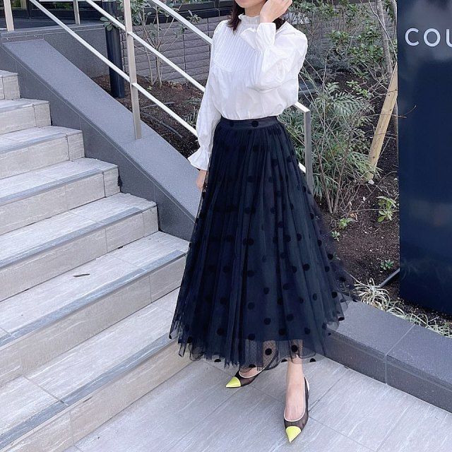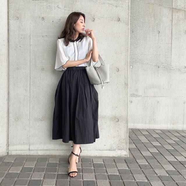 白ブラウス×黒のふんわりスカートのコーデ