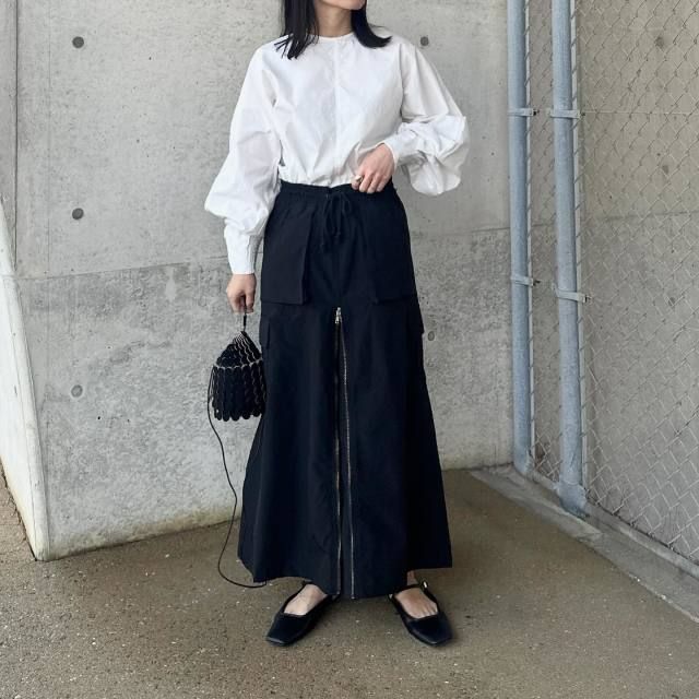 白ボリュームスリーブブラウス×黒スカートのコーデ