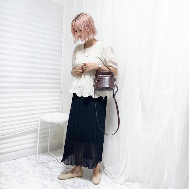 白ブラウス×黒シアースカートのコーデ