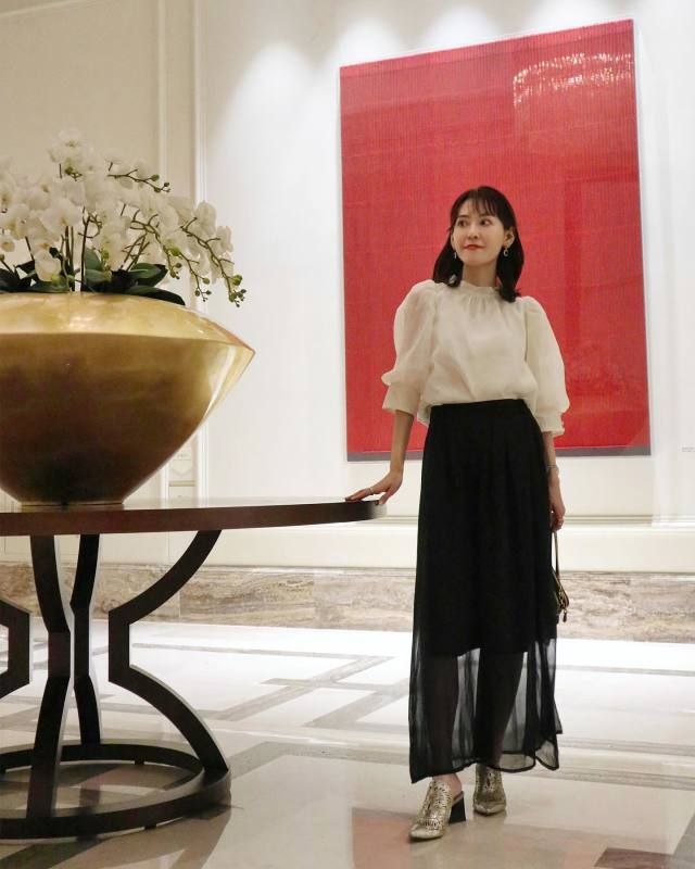 白シアーブラウス×黒スカートのコーデ
